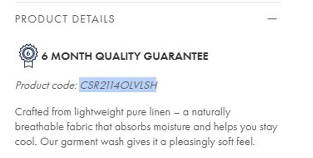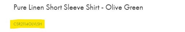 Please note: The product code is dynamic and it changes when you select a different colour or fit, so if you toggle sizes and fit ensure you’ve made a note of the new product code. It is also important to note that when you select a size, this is added to the end of the product code. For example “CSR2114OLV" in a large becomes CSR2114OLVLSH”